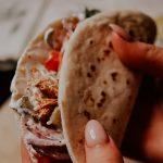 Asamblam gyros-ul: luăm câte o pita, așezăm 1/4 din pieptul de pui preparat, apoi castravete, roșie, și o lingură de sos tzatziki .